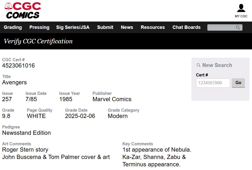 Avengers #257 CGC 9.8 White Pages Newsstand 1st Appearance Nebula 1985 Marvel Comics