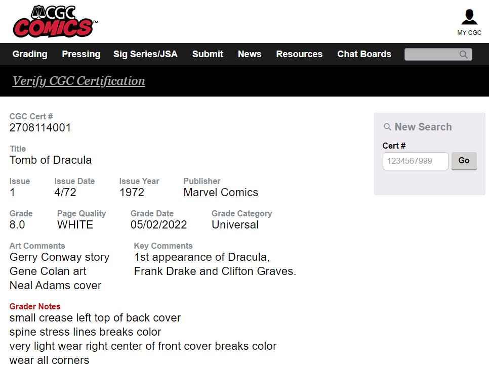 Tomb of Dracula #1 CGC 8.0 White Pages 1972 Marvel Comics 1st Appearance Dracula